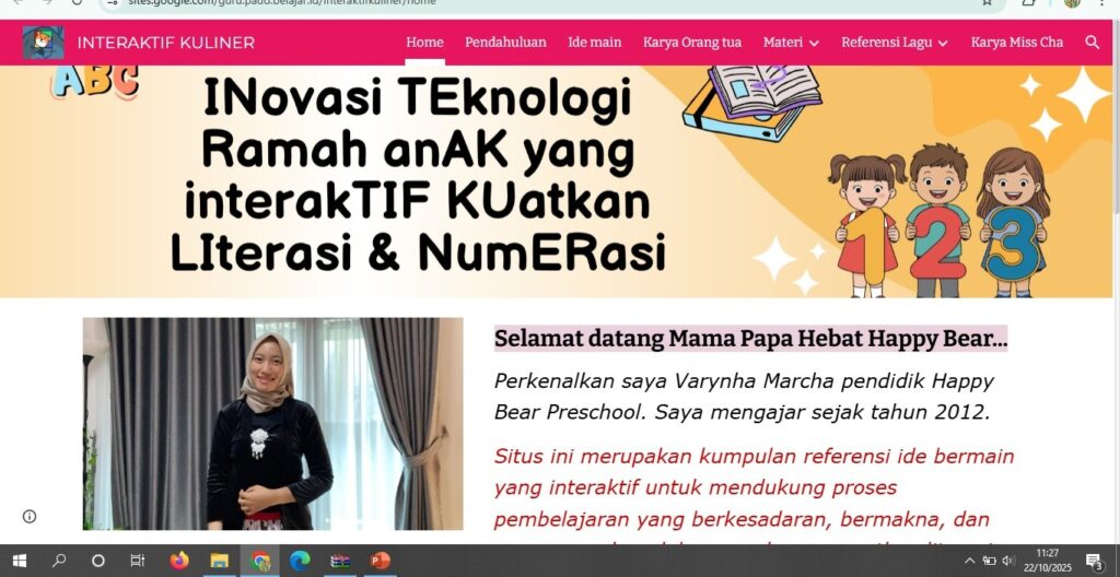 Hallo Mama Papa Hebat Happy Bear, perkenalkan sebuah inovasi Transformatif dari Miss Marcha. Sebuah sistem menggunakan G -Site yang fokus pada diskusi Literasi dan Numerasi. Dengan Nama INTERAKTIF KULINER yang berarti Inovasi Teknologi Ramah Anak yang interAKTif KUatkan Literasi & NUmerasi.